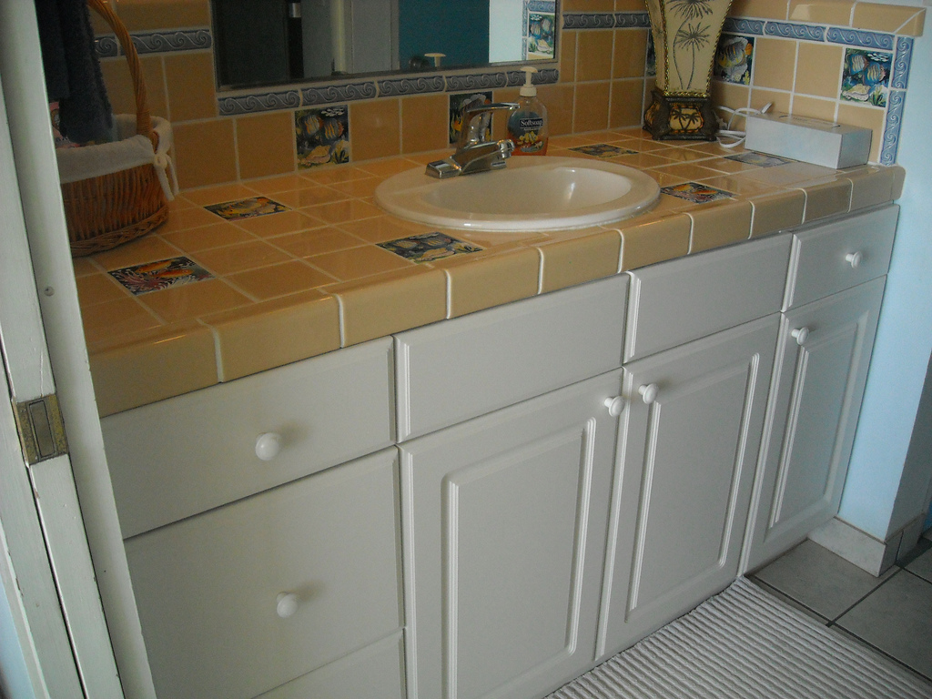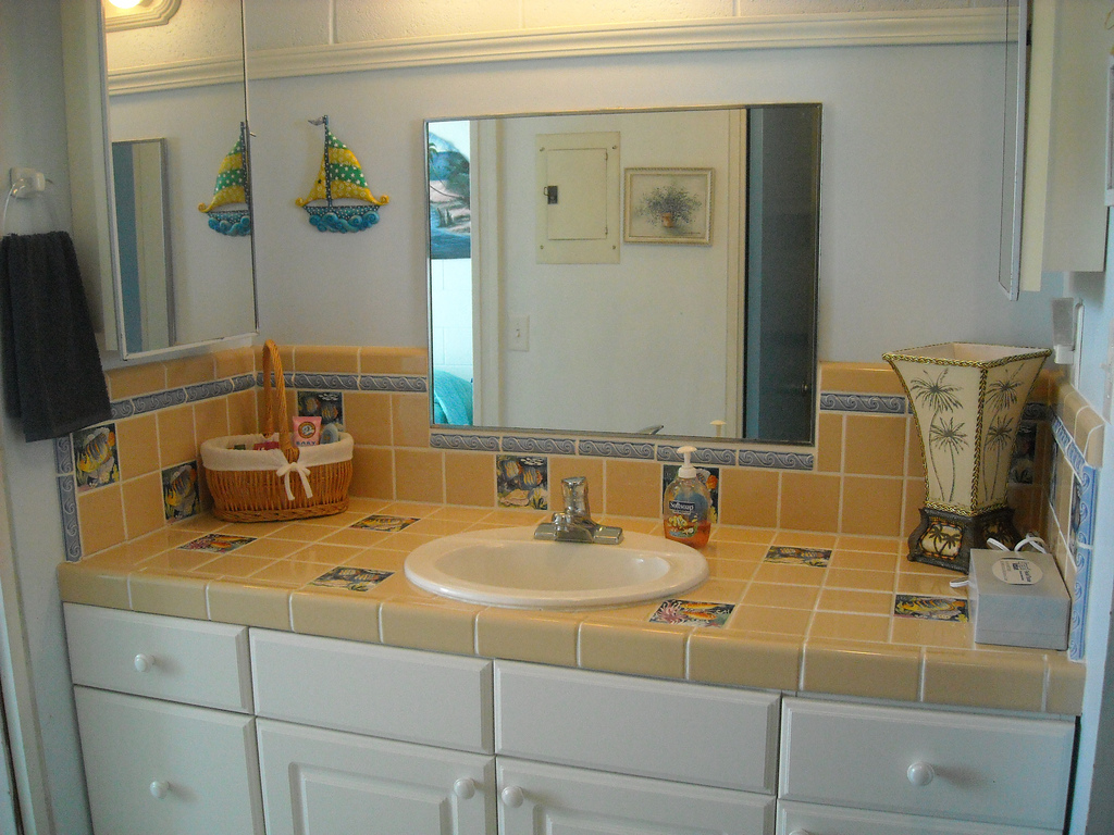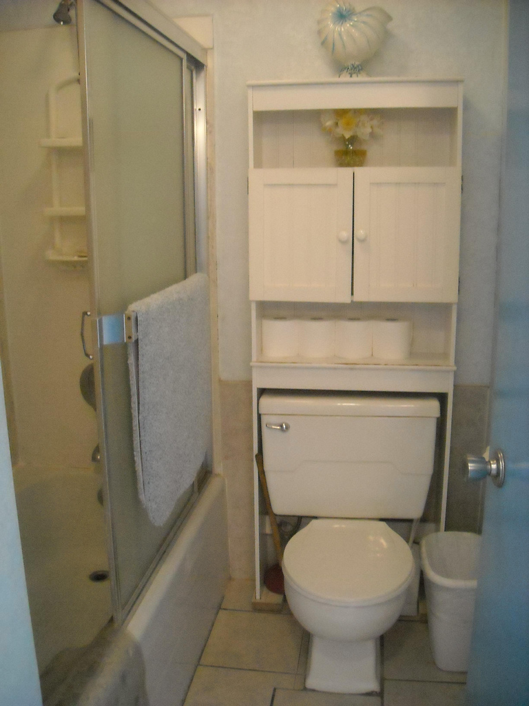 The blue door reflected in the bathroom mirror is a linen closet with all the items you'll need: queen size bed sheets, large bathroom towels, beach towels, washrags and hand towels, laundry soap, and a fire extinguisher.