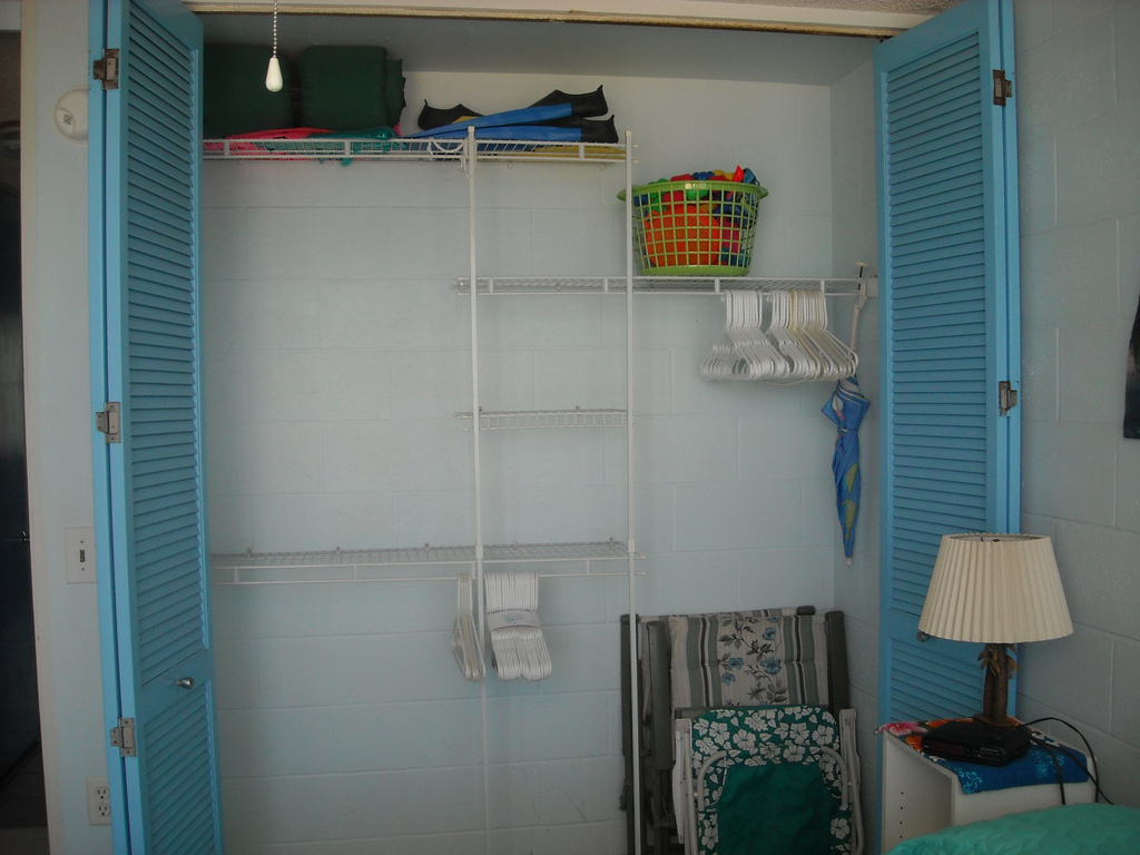 The closet has plenty of hangers and shelving along with beach chairs, a beach umbrella, and some sand toys.