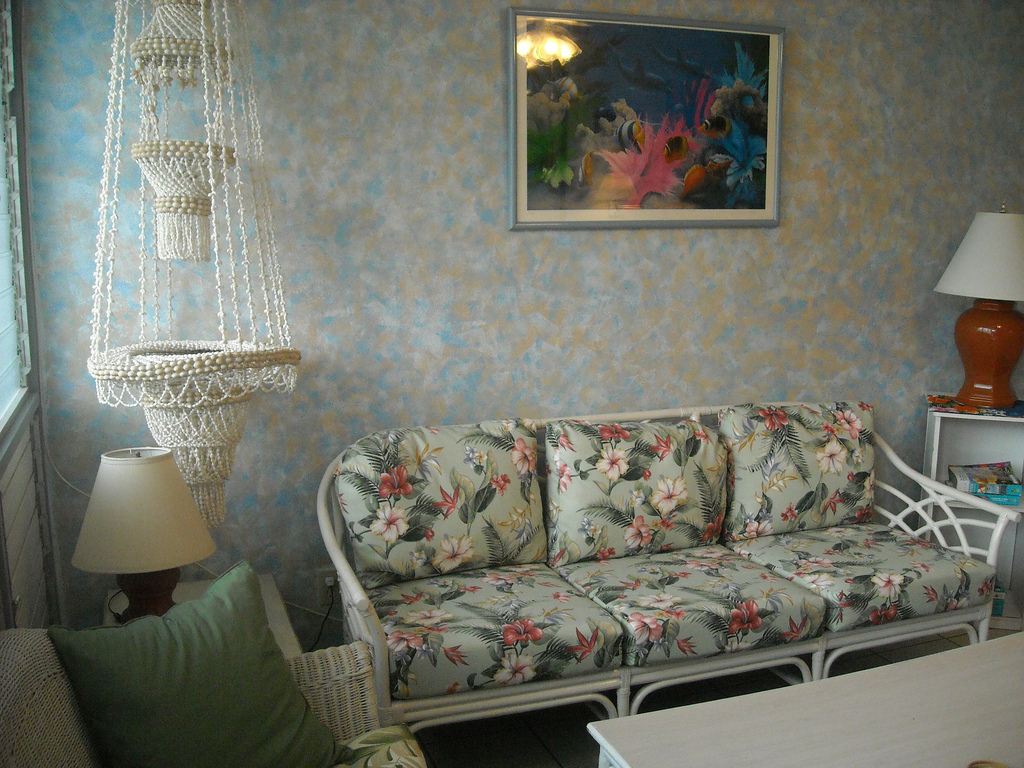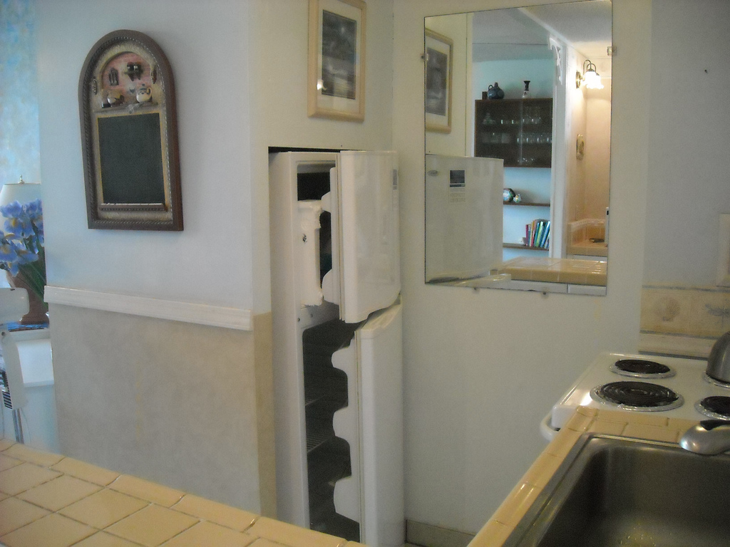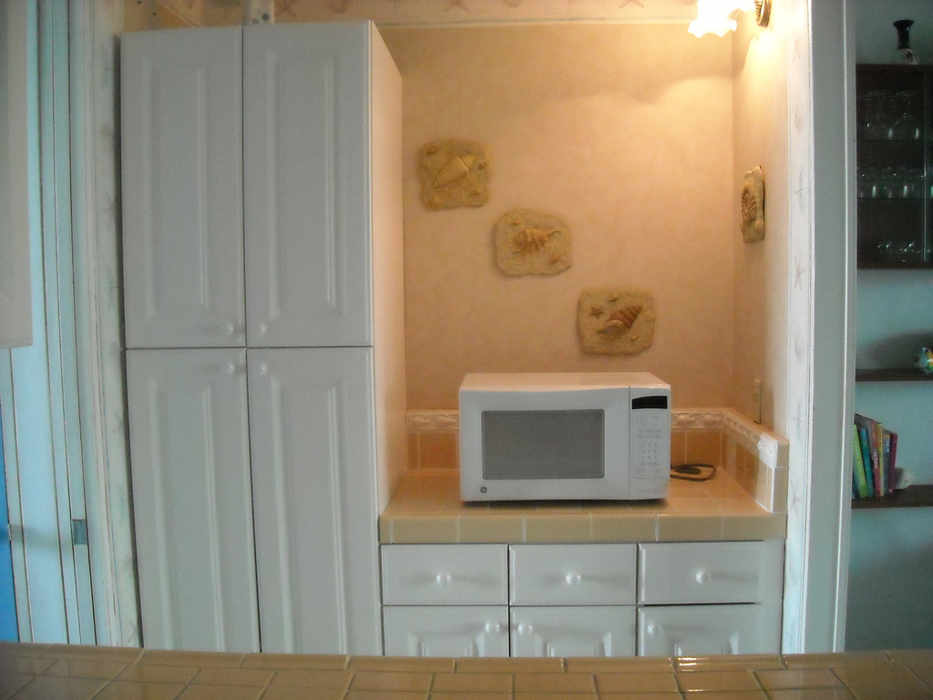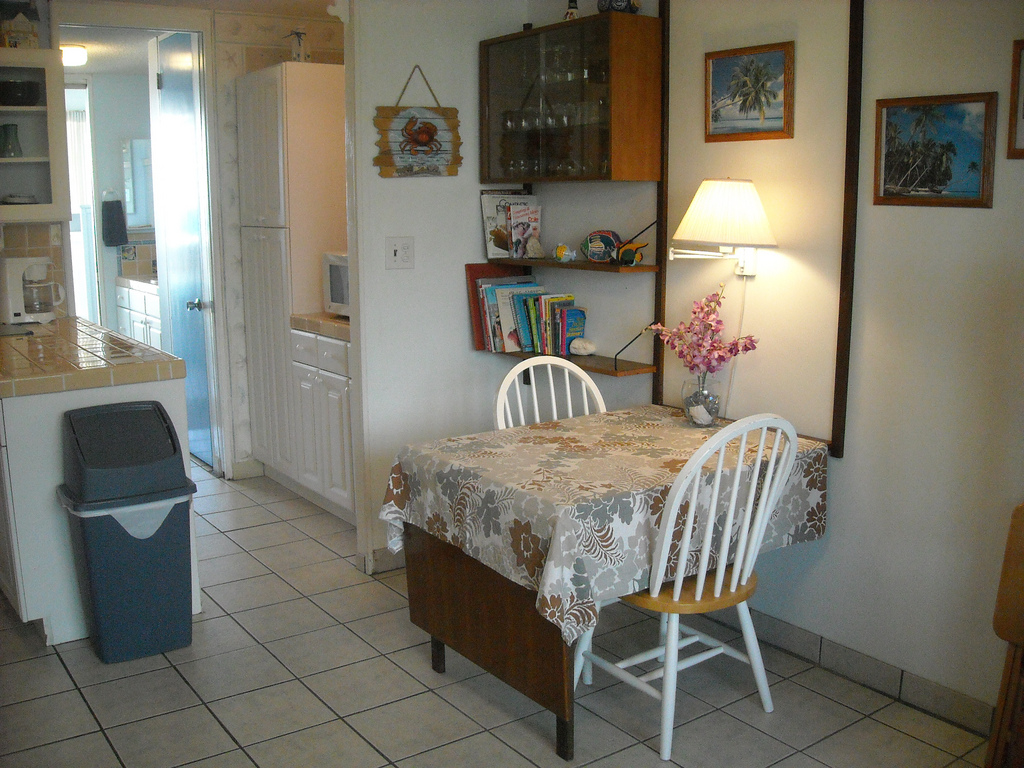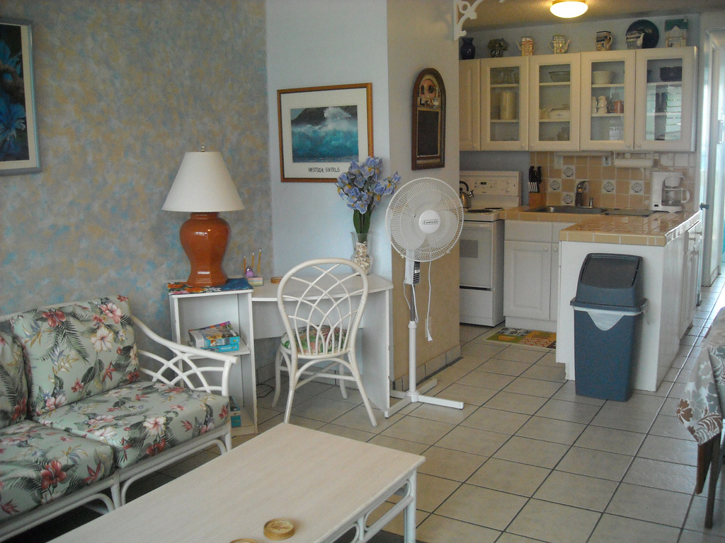 The kitchen is fully supplied with an electric stove, refrigerator/freezer, dishes, silverware, bowls, pots & pans, and baking supplies. The kitchen also has a coffee pot, toaster, blender for those tropical drinks, and even an iron for those who need it. Sorry, no dishwasher.