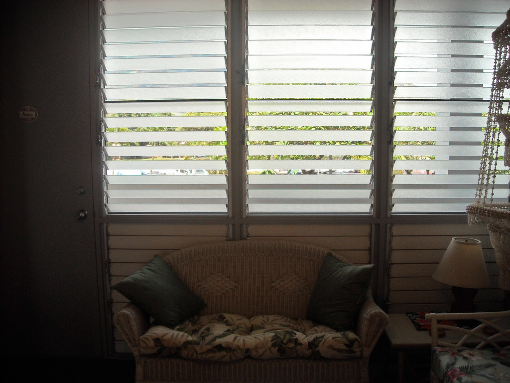 This is the living room. The couch faces a small entertainment center with a TV. To the left are louvered windows with a view of the Makaha Valley. These provide an excellent breeze when opened.