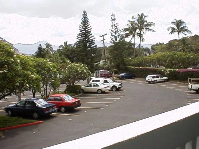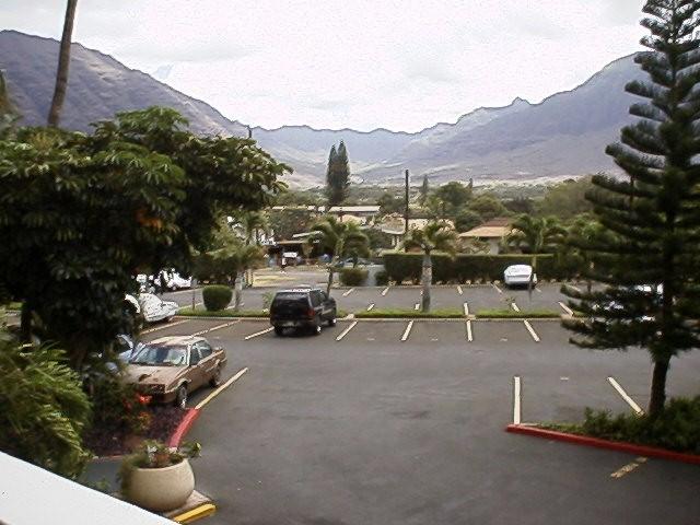 From the walkway in front of the unit, a view up the Makaha Valley. You can see the parking lot in the foreground.
